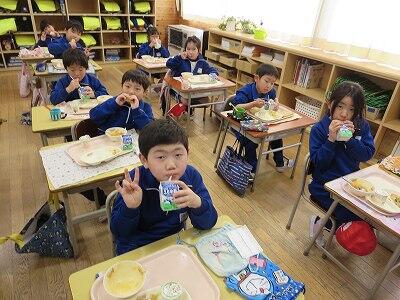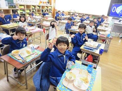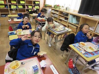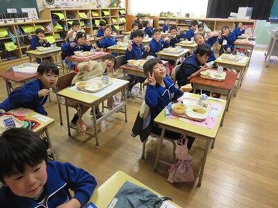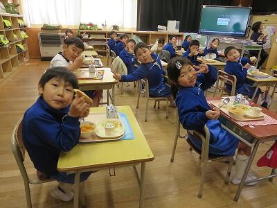 1組から順番に6~7人ずつ、そこに校長が加わり、ランチルームに一堂に会し、楽しくおしゃべりをしながら一緒に給食をいただきます。今日がその「5組目」となりました。