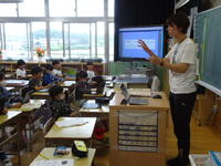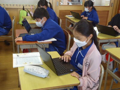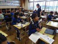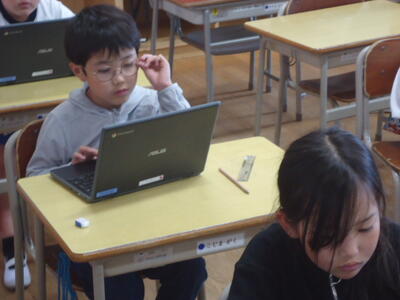 5年1組「社会」の授業では、タブレットPCを活用しながら、「真岡市」の特徴や素晴らしい点等について調べていました。