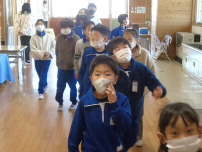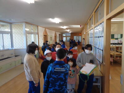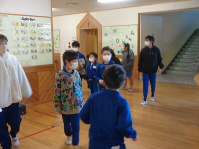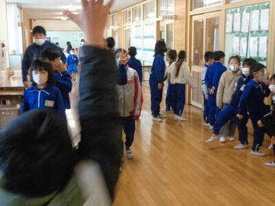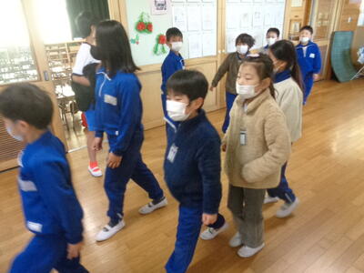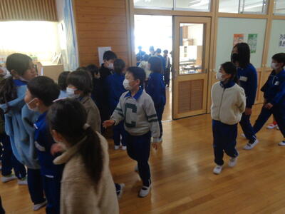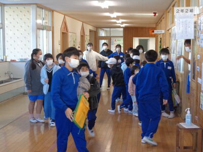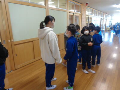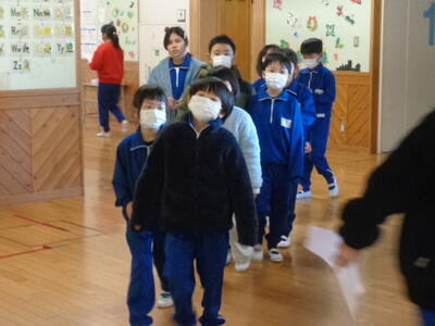 →その場に座って、放送を聞く。教室内でも廊下でもその場に座る。放送が聞き終わったら、6年生は1年生を教室まで連れていく。