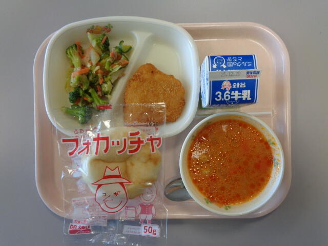 フォカッチャ 牛乳 チキンカツレツ イタリアンサラダ トマトクリームスープ