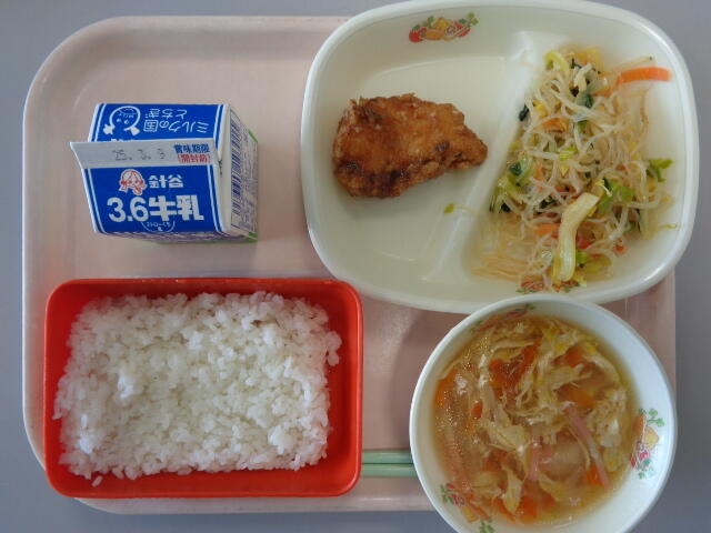 ごはん 牛乳 豚カルビ丼の具 春雨の中華和え 白菜と水餃子のスープ
