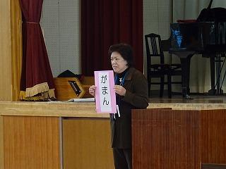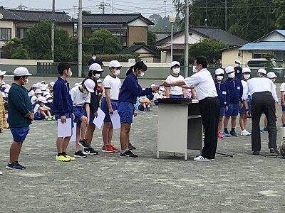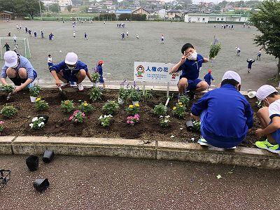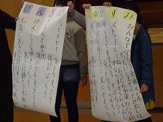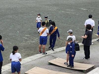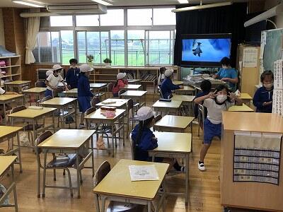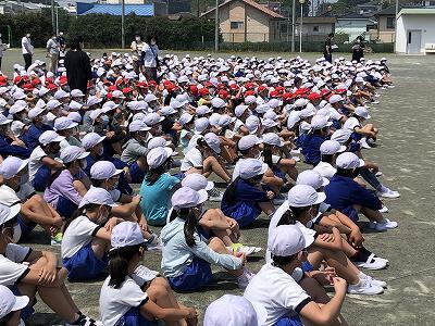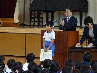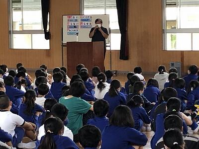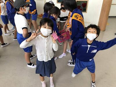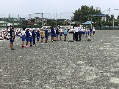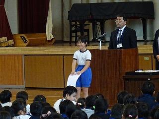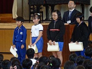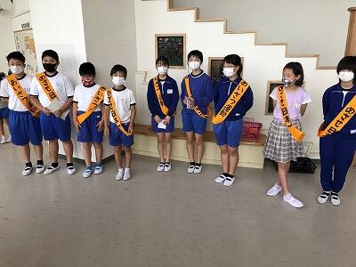 これは、児童会の企画委員会の子どもたちが「めざせ日本一・あいさつ運動」のたすきを付けて、明るく元気なあいさつを呼び掛けているものです。