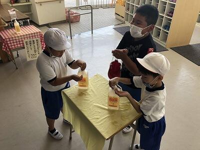 竹を使っての手作り水鉄砲、竹を切ったり、穴をあけたり、みんなと協力して作りました。