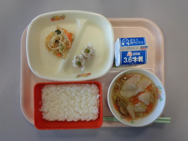 ごはん 牛乳 シューマイ② バンバンジーサラダ ワンタンスープ