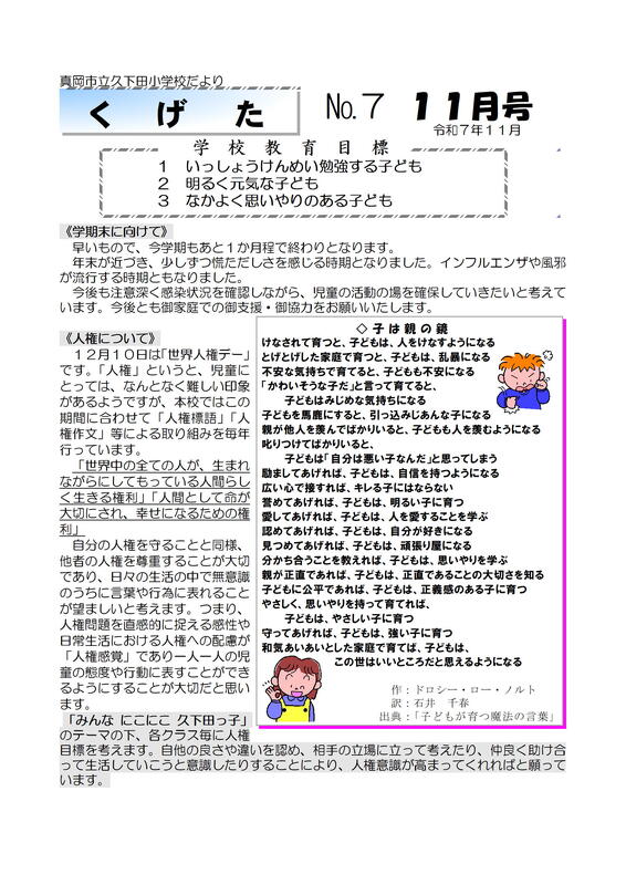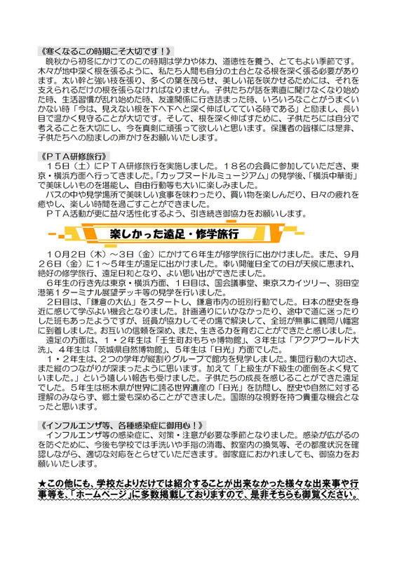 早いもので、11月も残り一週を残すのみとなりました。まさに「冬本番」に向かってまっしぐらですね。子供たちの健康管理にはこれまで以上に気を付け、最後まで充実した「2学期」にしていきますので、御家庭におかれましても、お子様への励ましの言葉かけや、健康管理等に御協力いただけますようお願い申し上げます。