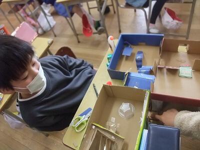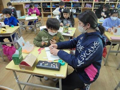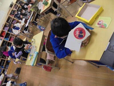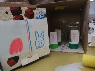 画用紙にあいた小さな穴をのぞく子どもたち。