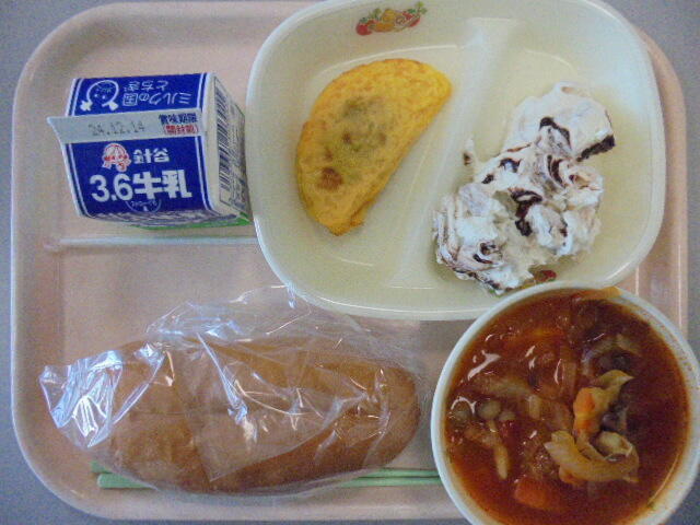 バナナクリームサンド(コッペパン) 牛乳 ミートオムレツ バナナクリームサンドの具 肉団子のトマトスープ