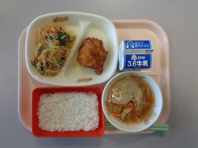 ごはん 牛乳 油淋鶏 春雨の中華和え ワンタンスープ
