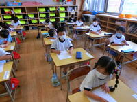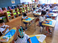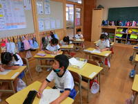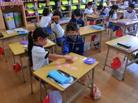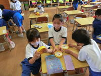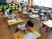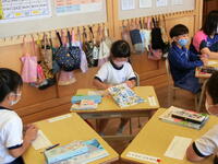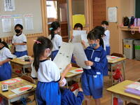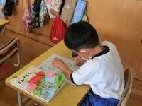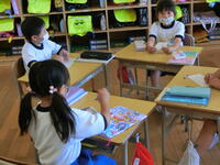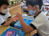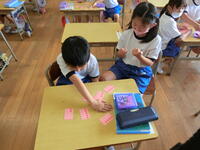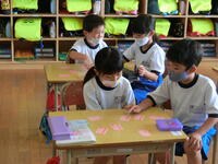 算数の時間では「いま なんじ」の学習をしました。「〇時」、「〇時はん」を習いました。算数セットに入っている時計を使って友達と問題を出し合ったり、一緒に確認したりしていて、自分たちで学習を振り返っているような姿が見られました。