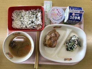 わかめごはん、牛乳、鶏肉のスタミナ焼き、ほうれん草とキャベツのツナあえ、ジャガイモのみそ汁、さくらゼリー