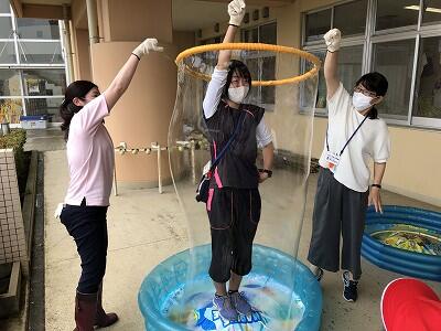 小さなシャボン玉から、われにくいシャボン玉、大きなシャボン玉、そして、人が入るくらい大きなシャボン玉と、あっという間の時間でした。