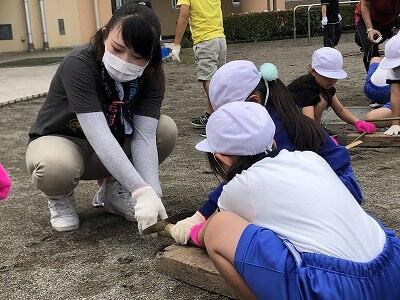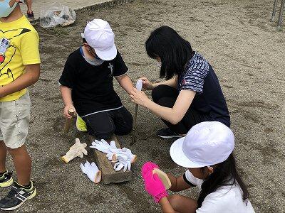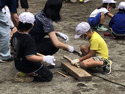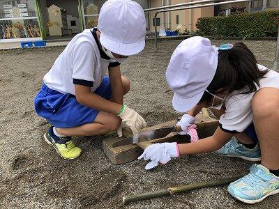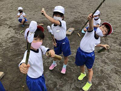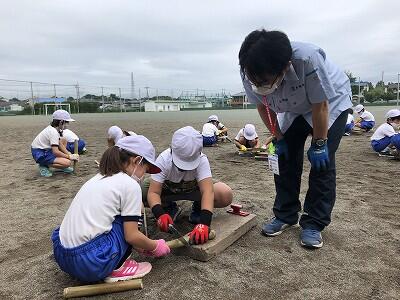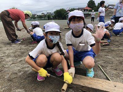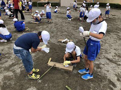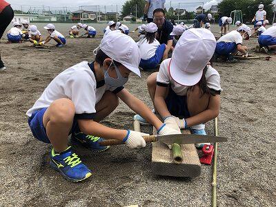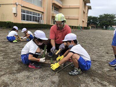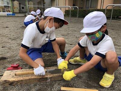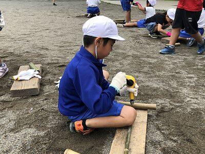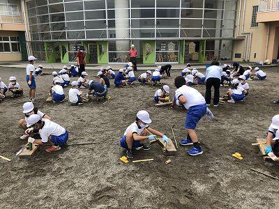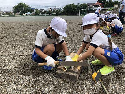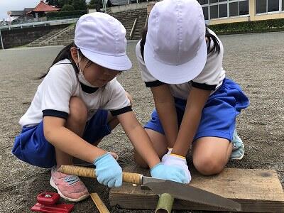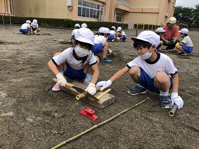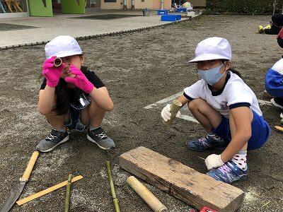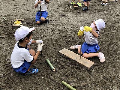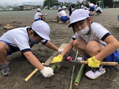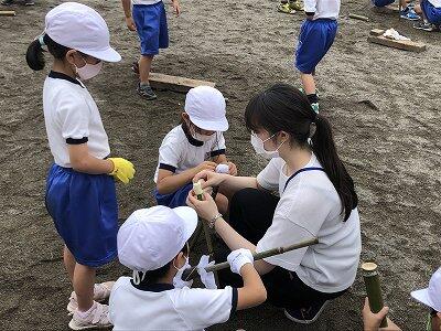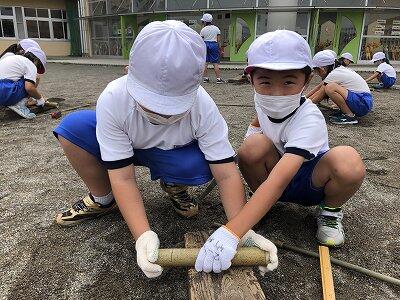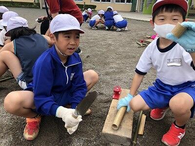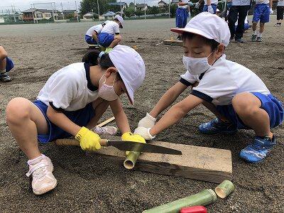 子どもたちには、のこぎりを使って切ったり、ひもで縛ったりするなど難しい活動がありましたが、よく頑張りました。二人で協力して取り組む姿は、素晴らしかったです。