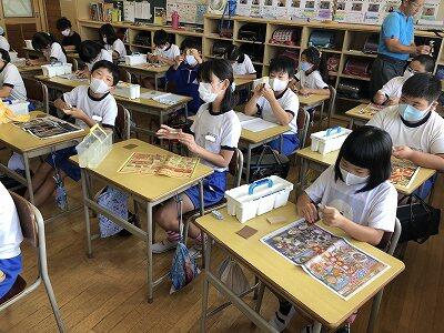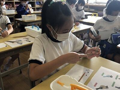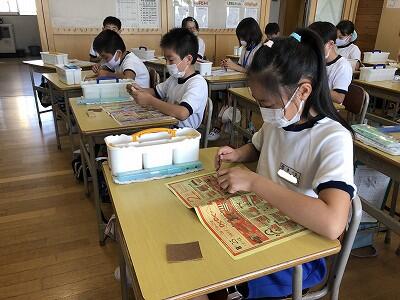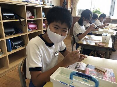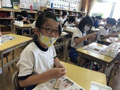 6年生は、火起こし体験と勾玉作りです。2クラスずつ、3日間で行います。
