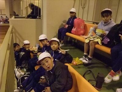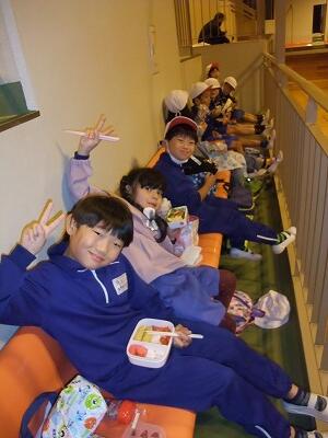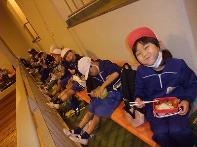 雨のため、益子の体育館でお弁当を食べました。
