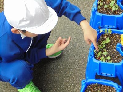 生活科で植えた二十日大根が少しずつ大きくなってきました。
