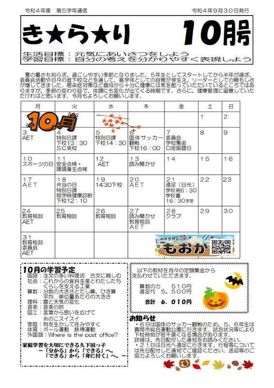 2学期が始まって1か月がたちました。5年生たちは毎日元気に過ごしています。
