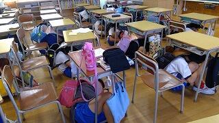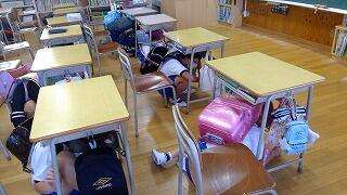 竜巻を想定した避難訓練を行いました。ランドセルのふたで頭や背中を守ります。6年生は体が大きいので机の下に隠れるのが大変でしたが、緊張感をもって訓練していました。