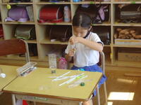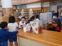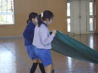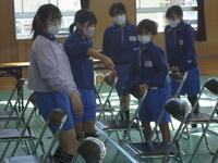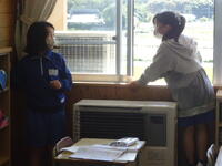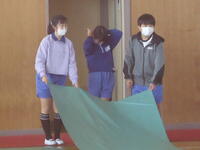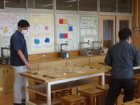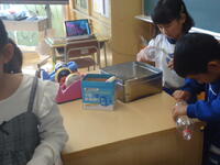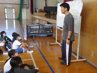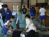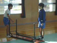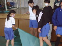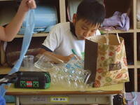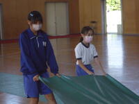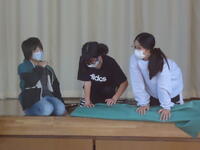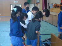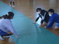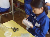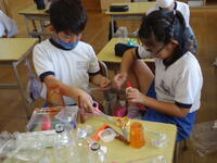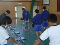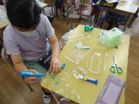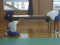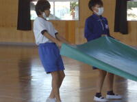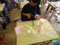 体育館では、理科で学習(空気の性質)した内容を、教材を使って実験を行っていました。