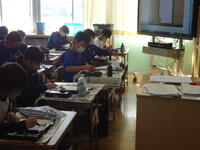 本日、真岡工業高校から先生と生徒さんをお招きして、「鹿沼組子によるペン立て作り」の御指導をいただきました。