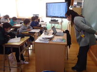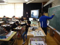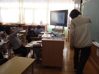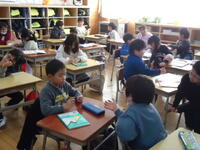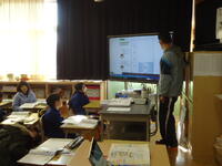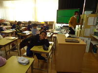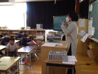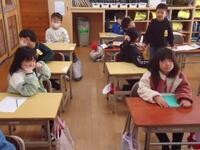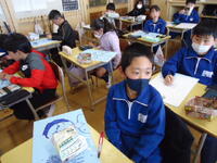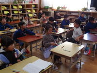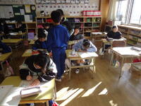 2年1組の教室でも2組と同様、「算数(はこのかたち)」の授業を行っており、家庭から持参した様々な「箱(6面体)」をノートに描き書き写す等、「箱には面が6つある」という事実に注目させるような授業を展開していました。子供たちは大変熱心に、そして意欲的に授業に臨んでいました(^^♪)