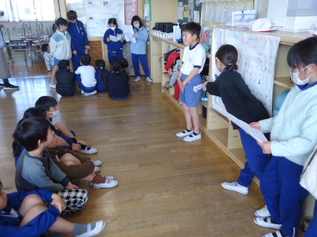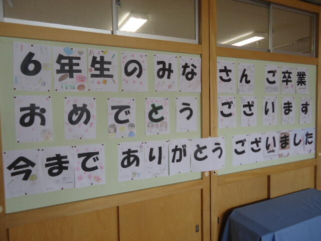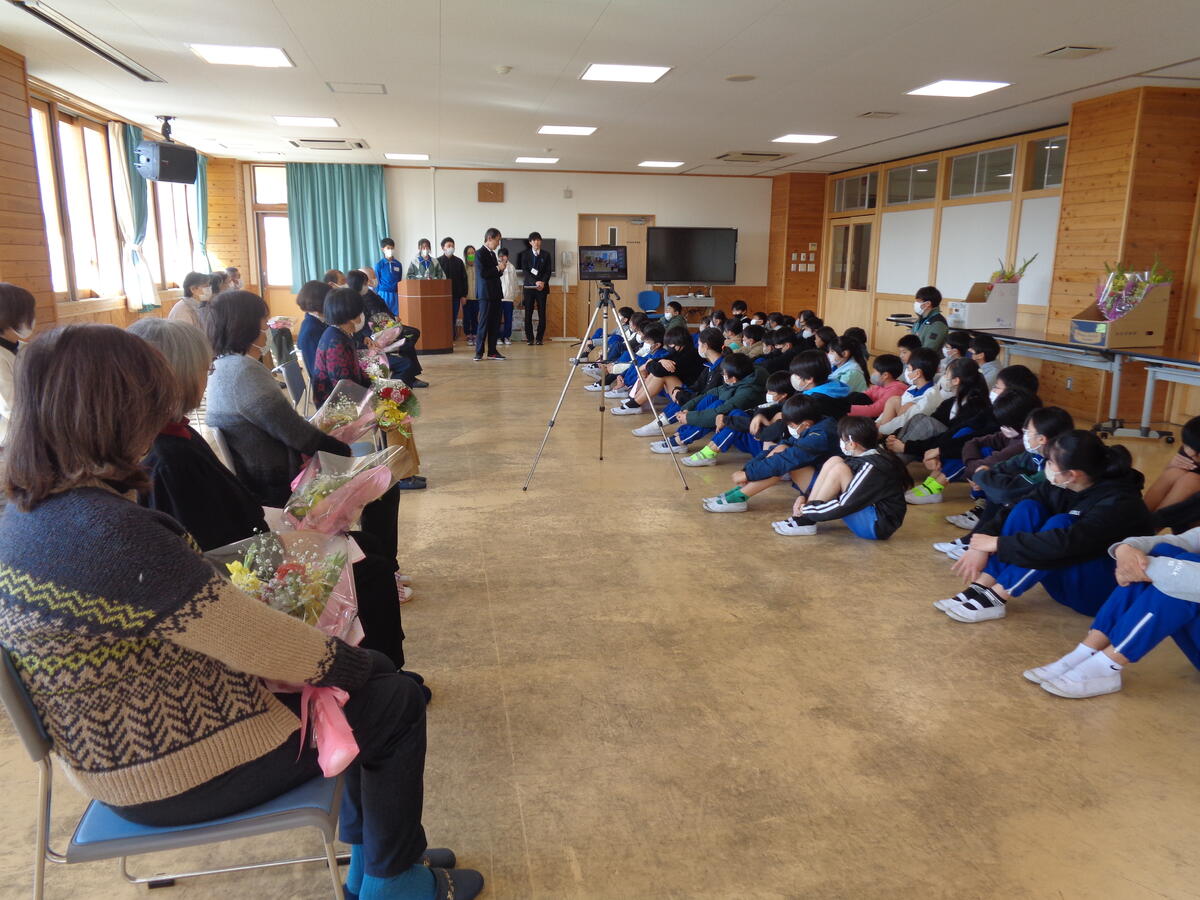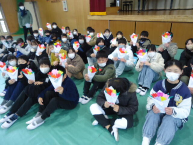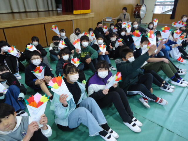 ④本日15日(金)には、卒業式に参加しない1~4年生児童と6年生児童との「お別れ式」を行いました。1~4年生児童が6年生に対し卒業を祝福し、感謝の気持ちをしっかりと表すことができました。とっても温かな、ホッコリとする雰囲気に包まれました。(*^_^*)。