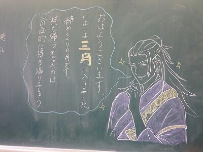 6年生担任の熱い思いが「黒板アート」に表れていますね。