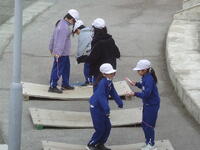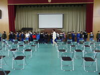 〇卒業生入場:昇降口前から各学級1列、1・2組の順で入場し、国旗前の観客席(ひな壇)に整列する。