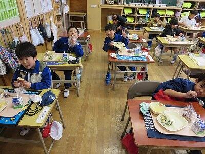 1組から順番に6~7人ずつ、そこに校長が加わり、ランチルームに一堂に会し、楽しくおしゃべりをしながら一緒に給食をいただきます。今日がその「5組目」となりました。