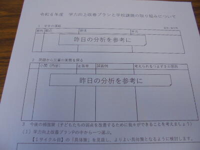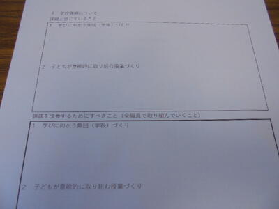 研修会④は「タブレットPCの効果的な使い方、そして研修会⑤は「学期始めに指導すること」としました。学校全体での指導の方向性を話し合い、学期始めの学級づくり等、組織的に取り組んでいけるようにするために、今後の取組と具体策について全職員間で今後の方向性を共有しました。本日の研修も建設的で活発な意見交換等があり、大変実り多い研修となりました。