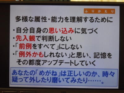 以上のようなことから、本日の研修は、各教職員一人一人が「人権」について、改めて振り返ることのできた大変貴重な研修会になったものと確信しております。