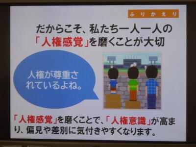 その解答は、お互いの人権を大切にする意識を持つこと、ということだと思います。 日常生活の中で無意識に行っていることが、場合によっては人権を侵害していることもあるので、振り返る機会を持つことが大事です。特に我々学校職員には、常に「子供の人権を守る」という責務、言い換えれば「一個の人格を持った存在」として子供を尊重し、一人一人を大切にすることがとても大切だと考えます。