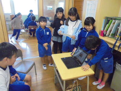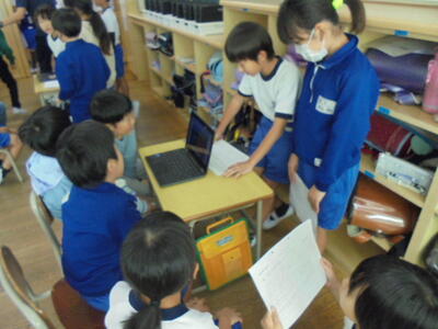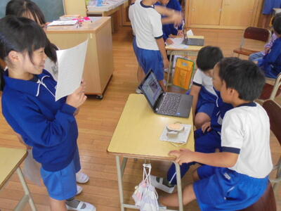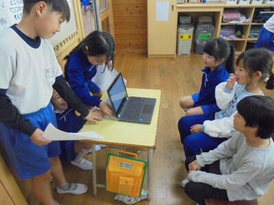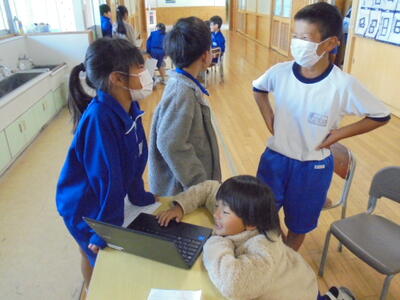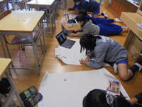 ★6年2組「総合」では、班毎に分かれ5年生に発表するための「修学旅行の思い出」を作成していました。