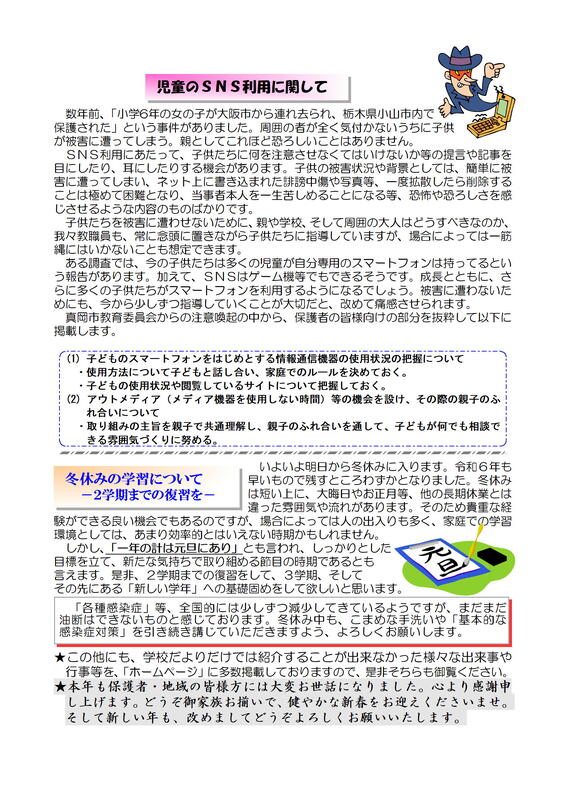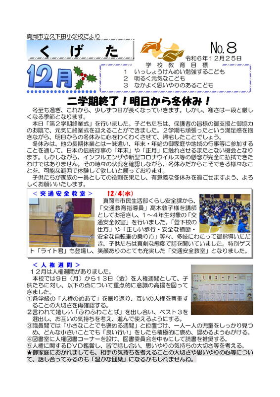 そして明日からの冬休み、子どもたちが自分から進んで学習やお手伝いに取り組むことができるよう、お声かけや励ましの言葉等を、是非よろしくお願いいたします。