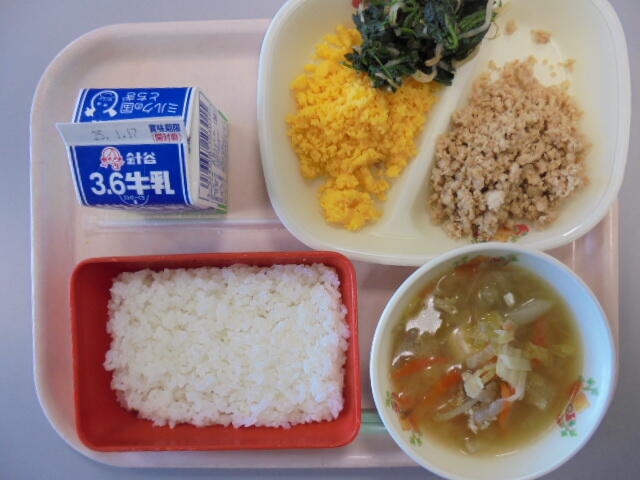 三色ごはん 牛乳 鶏そぼろ・卵そぼろ・おひたし スキー汁(新潟県の郷土料理)