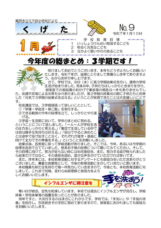 新たな年「令和7年」がスタートし、子供たちの笑顔と元気な笑い声に包まれた「活気溢れる久下田小学校」が戻ってきました。さすがに朝夕等はまだまだ厳しい寒さですが、昼間は比較的暖かく快適で爽やかな陽気に包まれ、子供たちは第3学期最初の学校生活を、明るく元気に過ごすことができました。