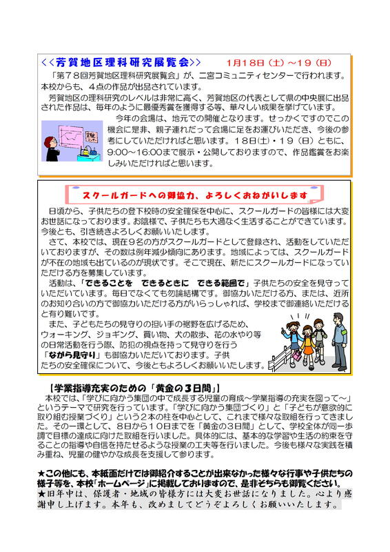 週末は、お子様と充実した楽しい時間をお過ごしいただき、心身の疲労を十分取り除き、そしてまた来週も元気に登校することが出来るよう、御対応や御配慮をお願いいたします。