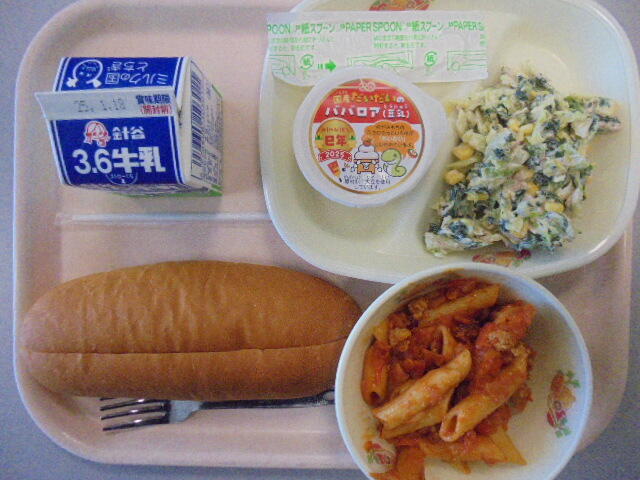 ミルクパン(スライス入り) 牛乳 ほうれん草とキャベツのツナ和え ミートソースペンネ 国産だいだいのムース