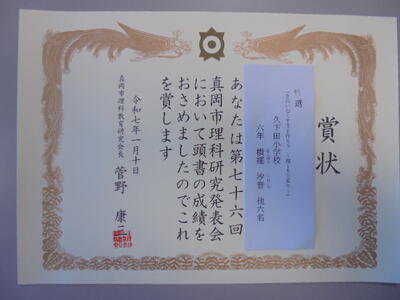 子供たちは少々緊張しながらも、自信を持って堂々と発表することができたようです。これまでの練習の成果を存分に発揮し、見事「特選」をいただきました。そして、1/20(月)に開催される「芳賀郡市理科研究発表会」に駒を進めることができました。