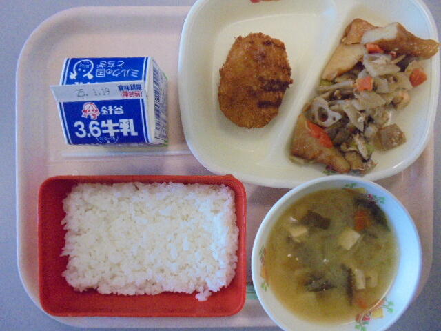 ごはん 牛乳 国産5種の野菜コロッケ・ソース かけがめ煮(筑前煮) 大根と油揚げのみそ汁