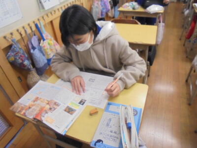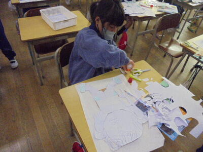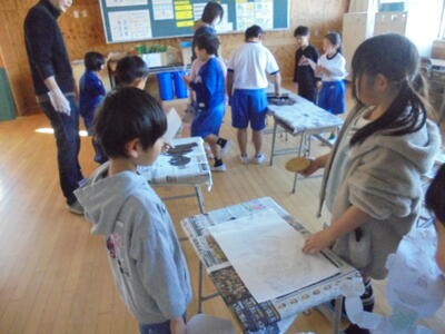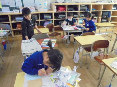 ★4年1組「図工」では、新聞紙を細く長く巻きながら、棒状に作り上げていました。