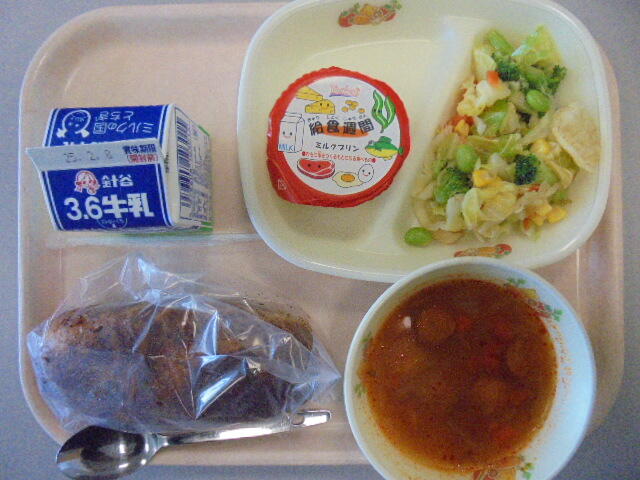 ココア揚げパン(給食センター手作りです♬) 牛乳 カリカリサラダ ひよこ豆のミネストローネ