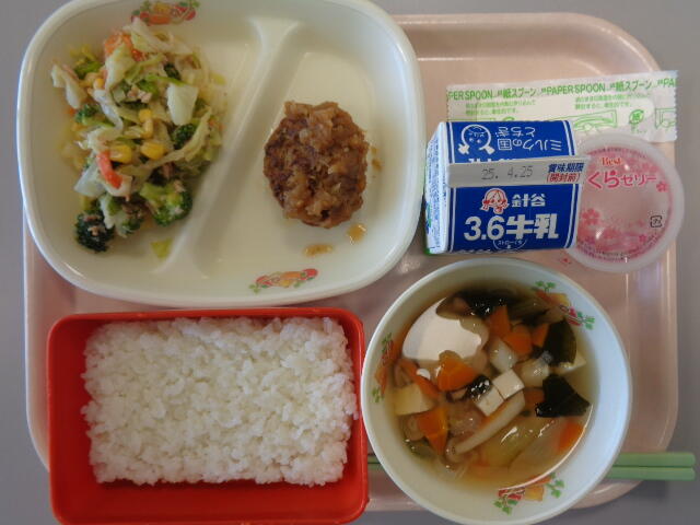 ごはん 牛乳 ハンバーグ和風ソース ツナと野菜のサラダ 桜なると入りすまし汁 さくらゼリー
