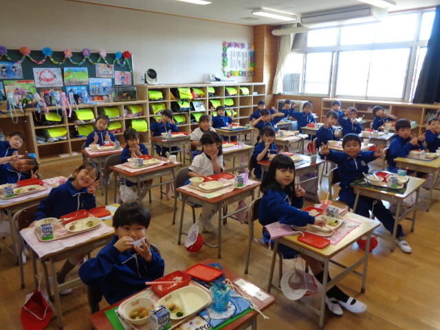 1年生児童がにっこり笑顔で、とても美味しい「学校給食」を食べています。