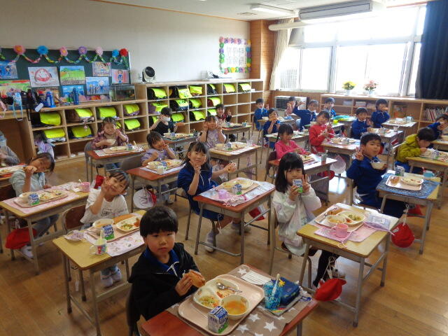 1年生児童が、本日初めての「学校給食」を経験しました。