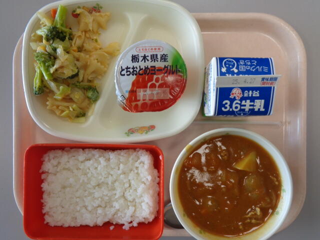 カレーライス(ごはん) 牛乳 ファルファーレのサラダ ポークカレー いちごヨーグルト