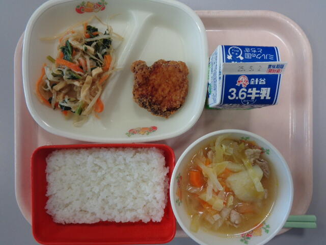 ごはん 牛乳 ザンギ(鶏のからあげ)小松菜と油揚げの和え物 どさんこ汁