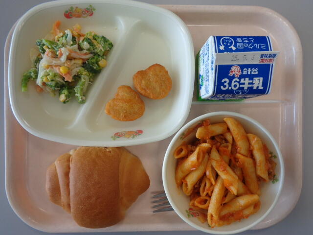 バターロール 牛乳 ナゲット② スイートコーンのサラダ ペンネボロネーゼ