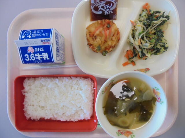 かき揚げ丼(ごはん) 牛乳 野菜のかき揚げ・小袋天つゆ ほうれん草のごま和え 豆腐とわかめのみそ汁