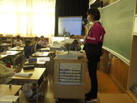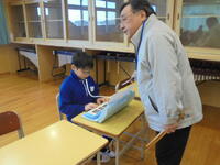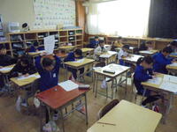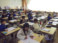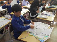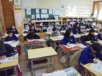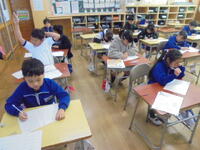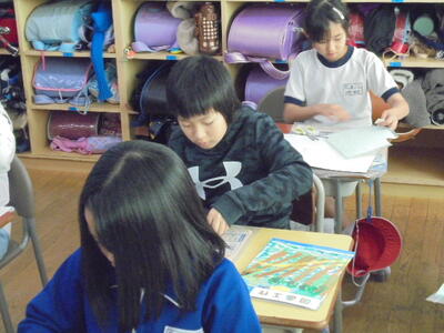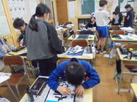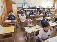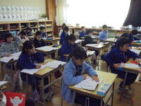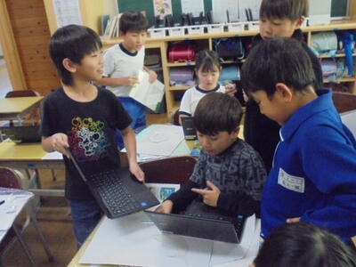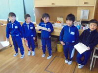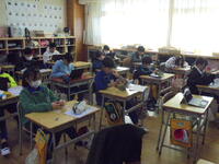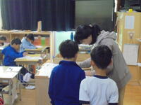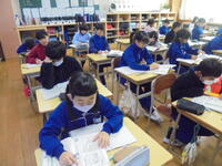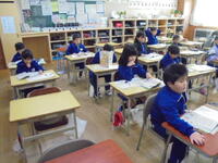 ★1年2組「国語」では、班毎に分かれて、みんな夢中になって「発表」の練習に取り組んでいました。
