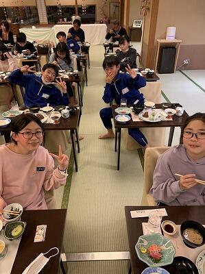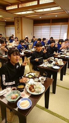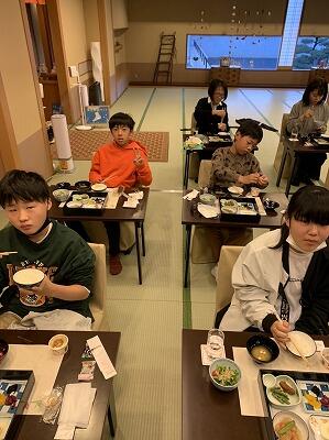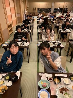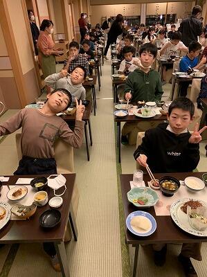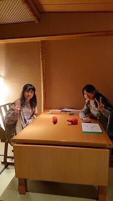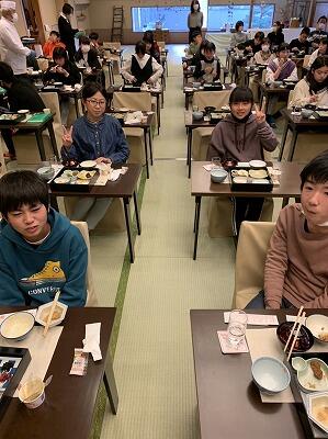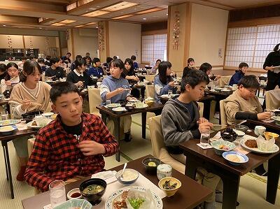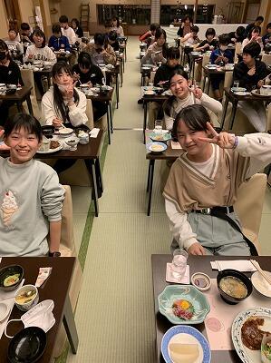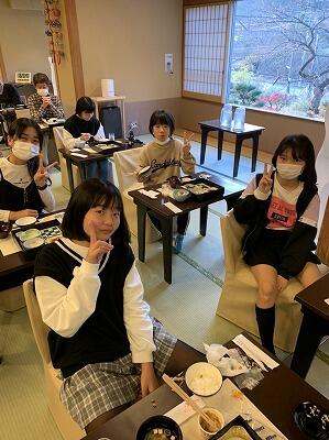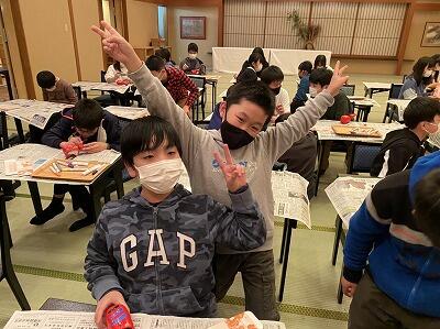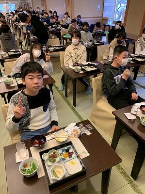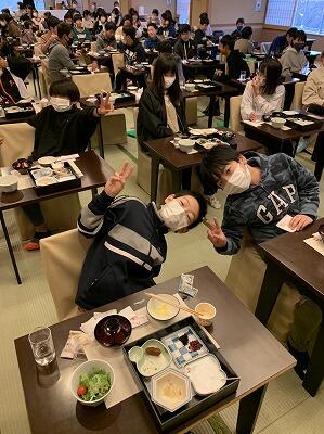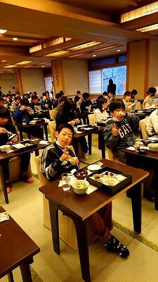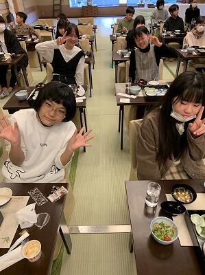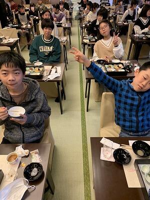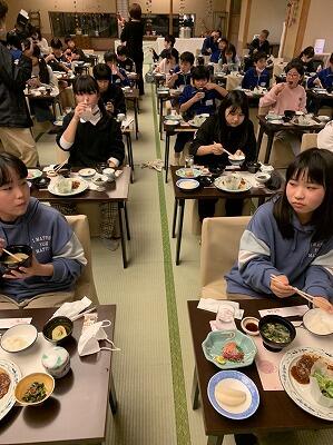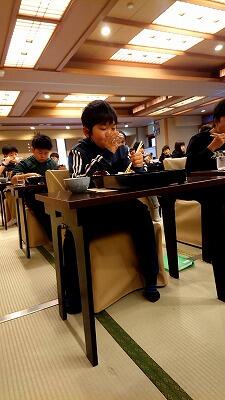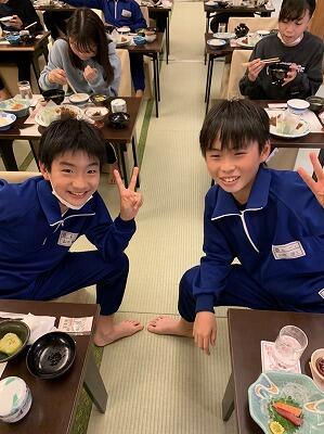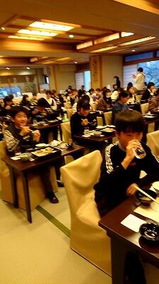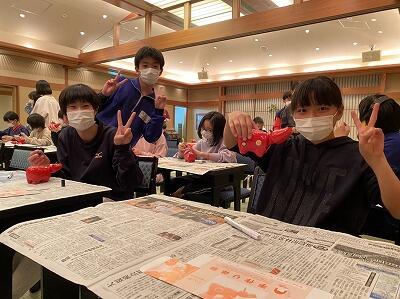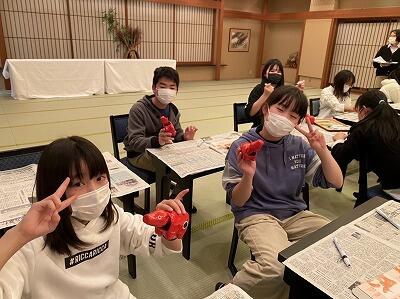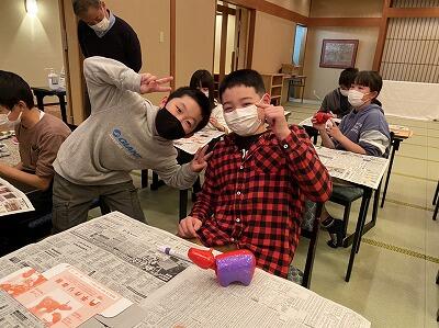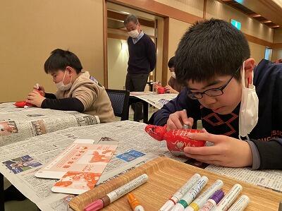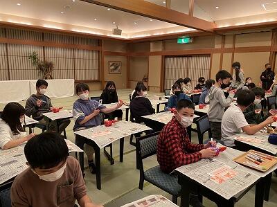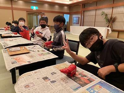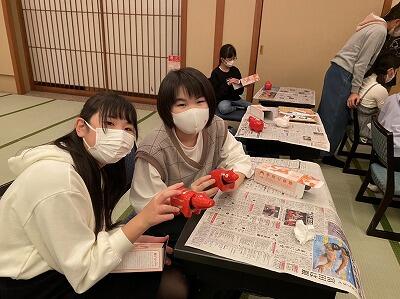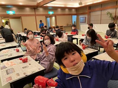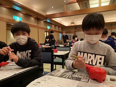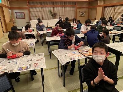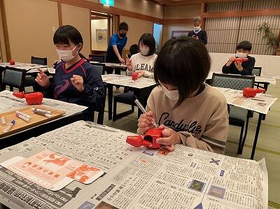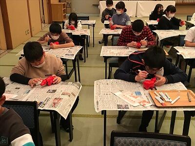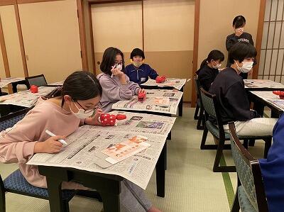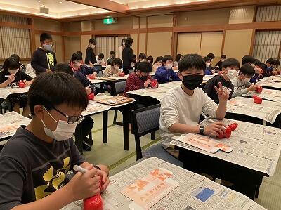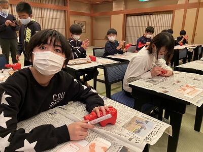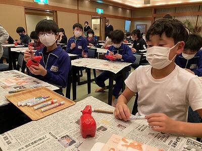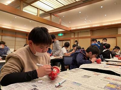 6年修学旅行、夕食前の「赤べこ絵づけ」の様子です。
